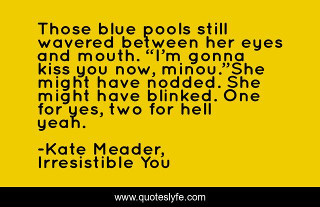This page presents the quote "Those blue pools still wavered between her eyes and mouth. “I’m gonna kiss you now, minou.”She might have nodded. She might have blinked. One for yes, two for hell yeah.". Author of this quote is Kate Meader, Irresistible You. This quote is about irresistible-you, hockey-player, chicago-rebels, kate-meader, kiss, hockey-romance,.