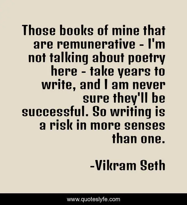 This page presents the quote "Those books of mine that are remunerative - I'm not talking about poetry here - take years to write, and I am never sure they'll be successful. So writing is a risk in more senses than one.". Author of this quote is Vikram Seth. This quote is about successful, writing,.