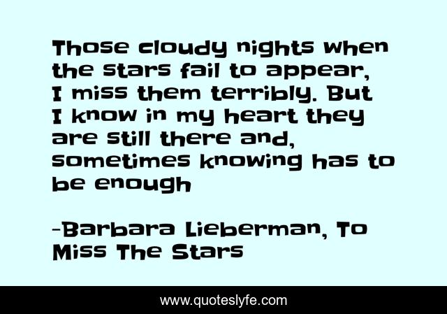 This page presents the quote "Those cloudy nights when the stars fail to appear, I miss them terribly. But I know in my heart they are still there and, sometimes knowing has to be enough". Author of this quote is Barbara Lieberman, To Miss The Stars. This quote is about knowing, cloudy-nights, cloudy, stars,.