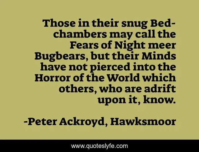This page presents the quote "Those in their snug Bed-chambers may call the Fears of Night meer Bugbears, but their Minds have not pierced into the Horror of the World which others, who are adrift upon it, know.". Author of this quote is Peter Ackroyd, Hawksmoor. This quote is about nightmares, fear, horror,.