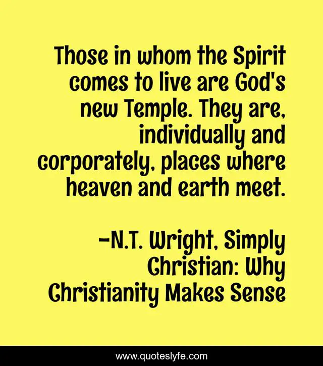 This page presents the quote "Those in whom the Spirit comes to live are God's new Temple. They are, individually and corporately, places where heaven and earth meet.". Author of this quote is N.T. Wright, Simply Christian: Why Christianity Makes Sense. This quote is about temple, holy-spirit,.