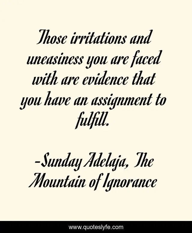 This page presents the quote "Those irritations and uneasiness you are faced with are evidence that you have an assignment to fulfill.". Author of this quote is Sunday Adelaja, The Mountain of Ignorance. This quote is about fulfilling-assignment, life, darkness, power, danger, light, people, ignorance, evidence,.