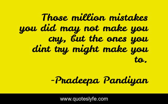 This page presents the quote "Those million mistakes you did may not make you cry, but the ones you dint try might make you to.". Author of this quote is Pradeepa Pandiyan. This quote is about mistakes, might, cry, million,.