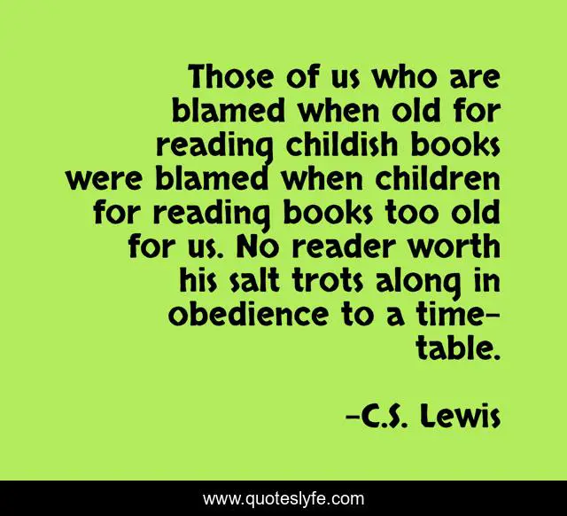 This page presents the quote "Those of us who are blamed when old for reading childish books were blamed when children for reading books too old for us. No reader worth his salt trots along in obedience to a time-table.". Author of this quote is C.S. Lewis. This quote is about maturation, curiosity, eclecticism, renewal,.