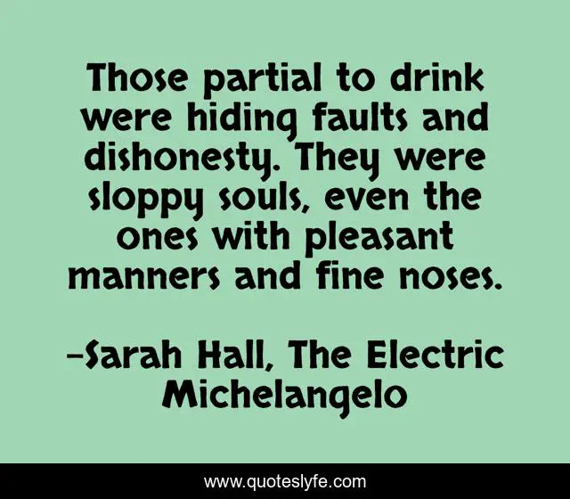 This page presents the quote "Those partial to drink were hiding faults and dishonesty. They were sloppy souls, even the ones with pleasant manners and fine noses.". Author of this quote is Sarah Hall, The Electric Michelangelo. .