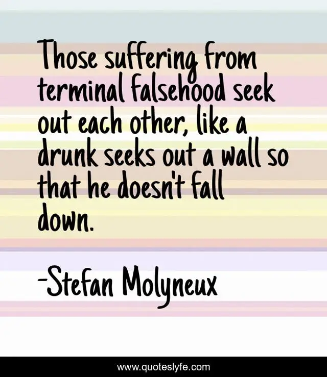 This page presents the quote "Those suffering from terminal falsehood seek out each other, like a drunk seeks out a wall so that he doesn't fall down.". Author of this quote is Stefan Molyneux. This quote is about falsehood, false, lies, lieing, society, fantasy,.