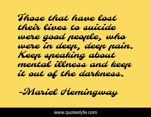 This page presents the quote "Those that have lost their lives to suicide were good people, who were in deep, deep pain. Keep speaking about mental illness and keep it out of the darkness.". Author of this quote is Mariel Hemingway. This quote is about stigma-of-suicide, suicide, mental-illness,.