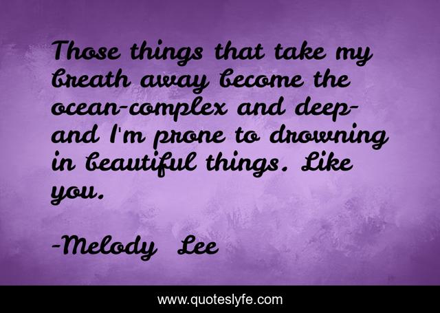 This page presents the quote "Those things that take my breath away become the ocean-complex and deep-and I'm prone to drowning in beautiful things. Like you.". Author of this quote is Melody Lee. This quote is about beautiful, breath, love, poetry, affection,.