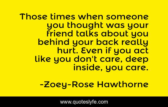 This page presents the quote "Those times when someone you thought was your friend talks about you behind your back really hurt. Even if you act like you don't care, deep inside, you care.". Author of this quote is Zoey-Rose Hawthorne. This quote is about different, lonely, emo, strange, inspirational, emotional, enthusiasm, weird, emotional-pain,.