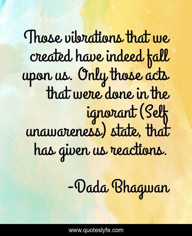 This page presents the quote "Those vibrations that we created have indeed fall upon us. Only those acts that were done in the ignorant (Self unawareness) state, that has given us reactions.". Author of this quote is Dada Bhagwan. This quote is about spiritual, self-awareness, effect, ignorance, self-realization, karma, cause,.