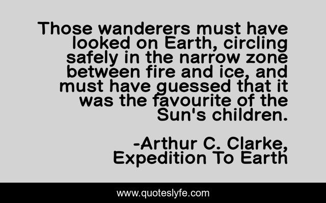 This page presents the quote "Those wanderers must have looked on Earth, circling safely in the narrow zone between fire and ice, and must have guessed that it was the favourite of the Sun's children.". Author of this quote is Arthur C. Clarke, Expedition To Earth. This quote is about arthur-c-clarke, science-fiction,.