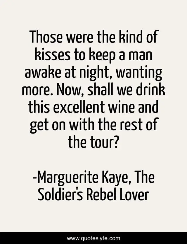 This page presents the quote "Those were the kind of kisses to keep a man awake at night, wanting more. Now, shall we drink this excellent wine and get on with the rest of the tour?". Author of this quote is Marguerite Kaye, The Soldier's Rebel Lover. .