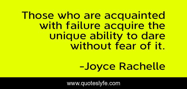 This page presents the quote "Those who are acquainted with failure acquire the unique ability to dare without fear of it.". Author of this quote is Joyce Rachelle. This quote is about success, failure, fear-of-failure, failure-and-success, failures, fear, dare-to-dream,.