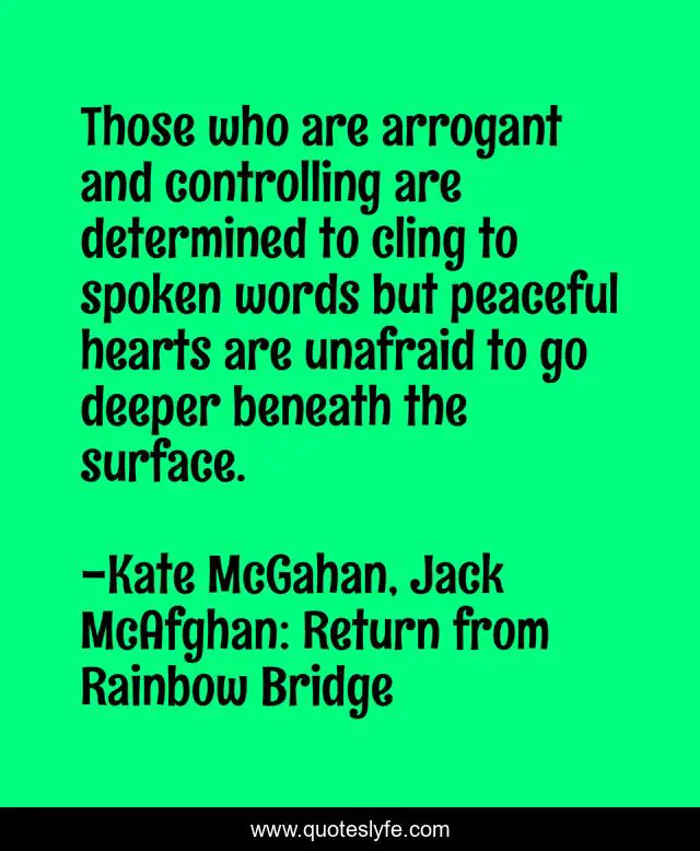 This page presents the quote "Those who are arrogant and controlling are determined to cling to spoken words but peaceful hearts are unafraid to go deeper beneath the surface.". Author of this quote is Kate McGahan, Jack McAfghan: Return from Rainbow Bridge. This quote is about control, quiet, depth, talk, words, peaceful, arrogant,.