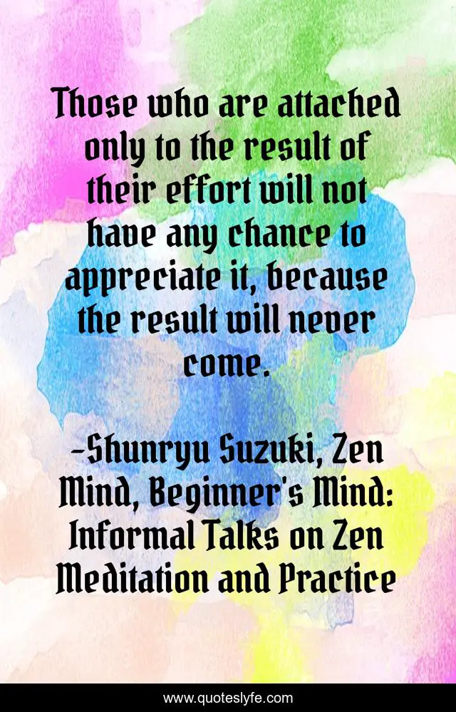 This page presents the quote "Those who are attached only to the result of their effort will not have any chance to appreciate it, because the result will never come.". Author of this quote is Shunryu Suzuki, Zen Mind, Beginner's Mind: Informal Talks on Zen Meditation and Practice. This quote is about not-philosophy, experience,.