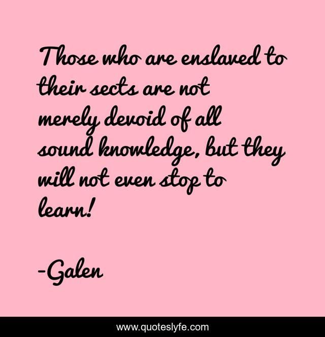 This page presents the quote "Those who are enslaved to their sects are not merely devoid of all sound knowledge, but they will not even stop to learn!". Author of this quote is Galen. This quote is about science, learning, knowledge, truth,.