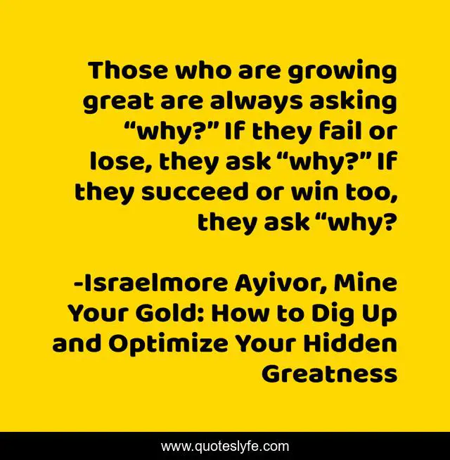 This page presents the quote "Those who are growing great are always asking “why?” If they fail or lose, they ask “why?” If they succeed or win too, they ask “why?". Author of this quote is Israelmore Ayivor, Mine Your Gold: How to Dig Up and Optimize Your Hidden Greatness. This quote is about food-for-thought, answer, success, ask-questions, successful, win, winner, question, answers,.