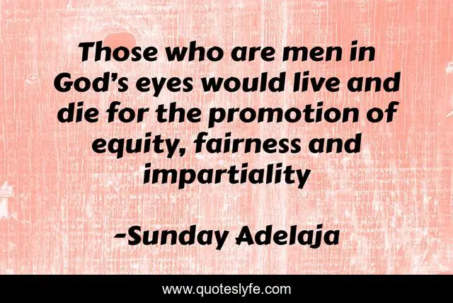 This page presents the quote "Those who are men in God’s eyes would live and die for the promotion of equity, fairness and impartiality". Author of this quote is Sunday Adelaja. This quote is about eyes, impartiality, god, men, life, live, fairness, equity, promotion,.