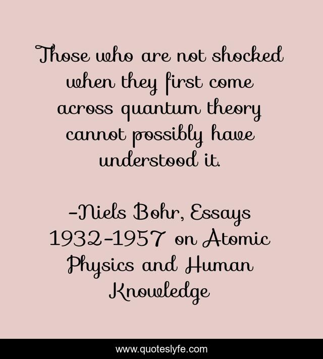 This page presents the quote "Those who are not shocked when they first come across quantum theory cannot possibly have understood it.". Author of this quote is Niels Bohr, Essays 1932-1957 on Atomic Physics and Human Knowledge. This quote is about science, reality, particles, strange, quantum, physics,.