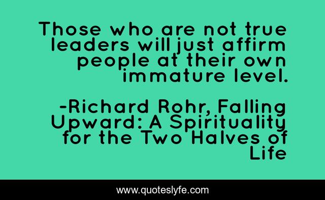 This page presents the quote "Those who are not true leaders will just affirm people at their own immature level.". Author of this quote is Richard Rohr, Falling Upward: A Spirituality for the Two Halves of Life. This quote is about discipleship, confrontation, leadership,.