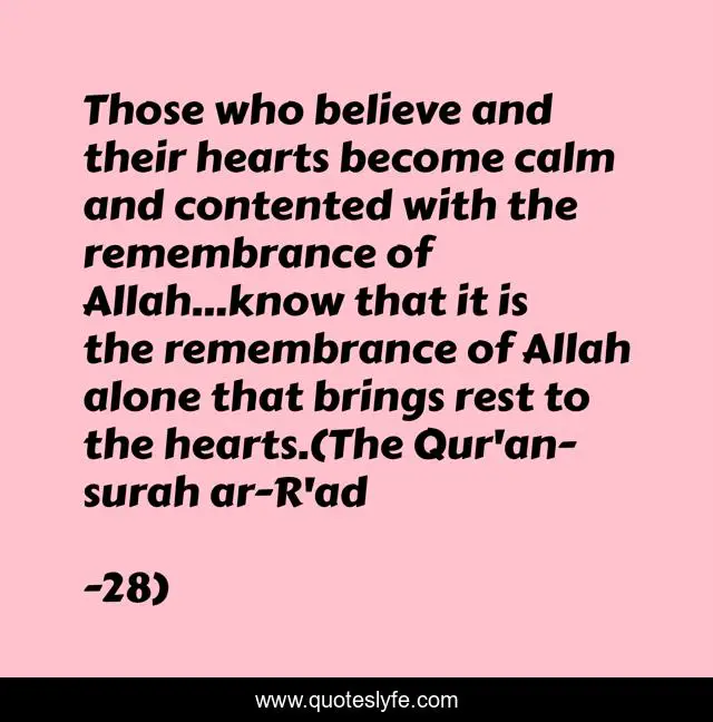 This page presents the quote "Those who believe and their hearts become calm and contented with the remembrance of Allah...know that it is the remembrance of Allah alone that brings rest to the hearts.(The Qur'an-surah ar-R'ad". Author of this quote is 28). .