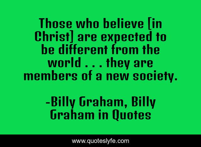 This page presents the quote "Those who believe [in Christ] are expected to be different from the world . . . they are members of a new society.". Author of this quote is Billy Graham, Billy Graham in Quotes. This quote is about the-world, billy-graham,.
