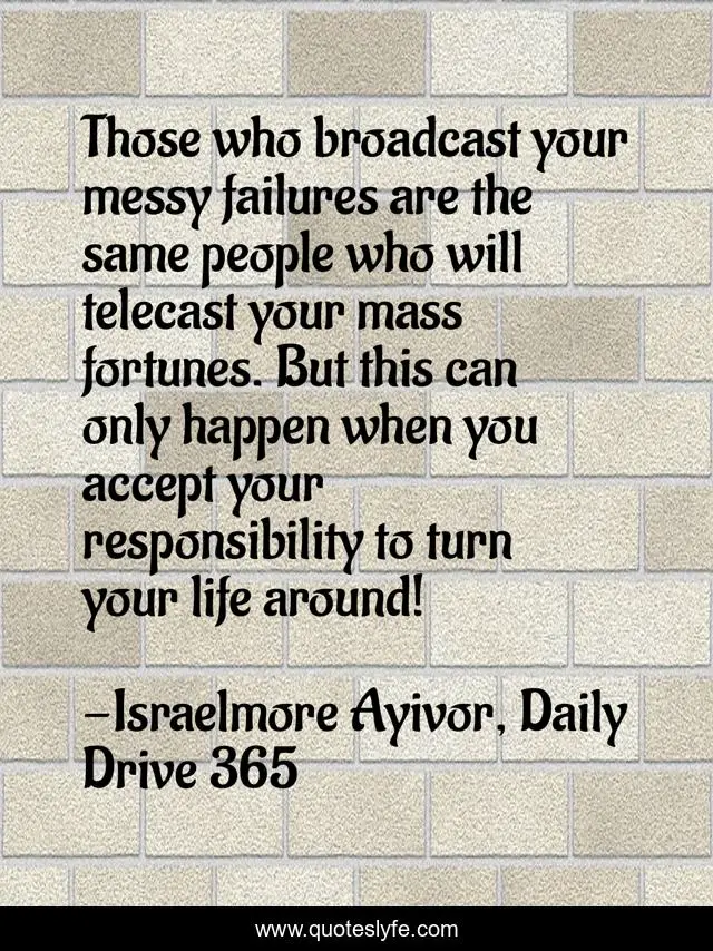 This page presents the quote "Those who broadcast your messy failures are the same people who will telecast your mass fortunes. But this can only happen when you accept your responsibility to turn your life around!". Author of this quote is Israelmore Ayivor, Daily Drive 365. This quote is about food-for-thought, success, people, successful, responsible, life, telecast, mess, fortunes,.