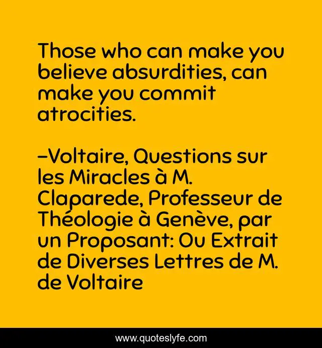 "Voltaire, Questions sur les Miracles à M. Claparede, Professeur de Théologie à Genève, par un Proposant: Ou Extrait de Diverses Lettres de M. de Voltaire Quotes." Quoteslyfe.com, 2025. Fri. 05 Dec. 2025. <https://www.quoteslyfe.com/quote/Those-who-can-make-you-believe-absurdities-29587>.