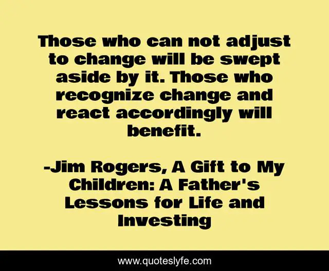 This page presents the quote "Those who can not adjust to change will be swept aside by it. Those who recognize change and react accordingly will benefit.". Author of this quote is Jim Rogers, A Gift to My Children: A Father's Lessons for Life and Investing. This quote is about enthusiasm, encourage, change, inspirational,.