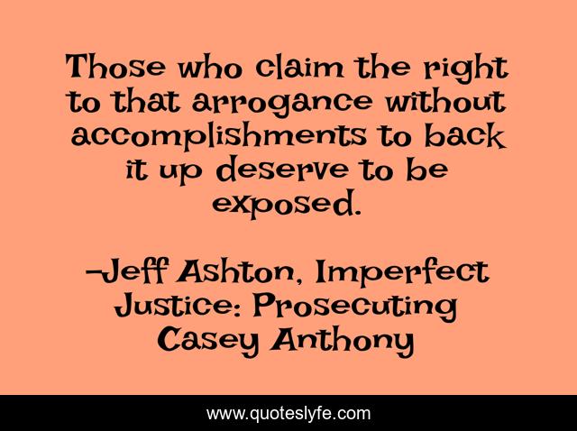 This page presents the quote "Those who claim the right to that arrogance without accomplishments to back it up deserve to be exposed.". Author of this quote is Jeff Ashton, Imperfect Justice: Prosecuting Casey Anthony. .