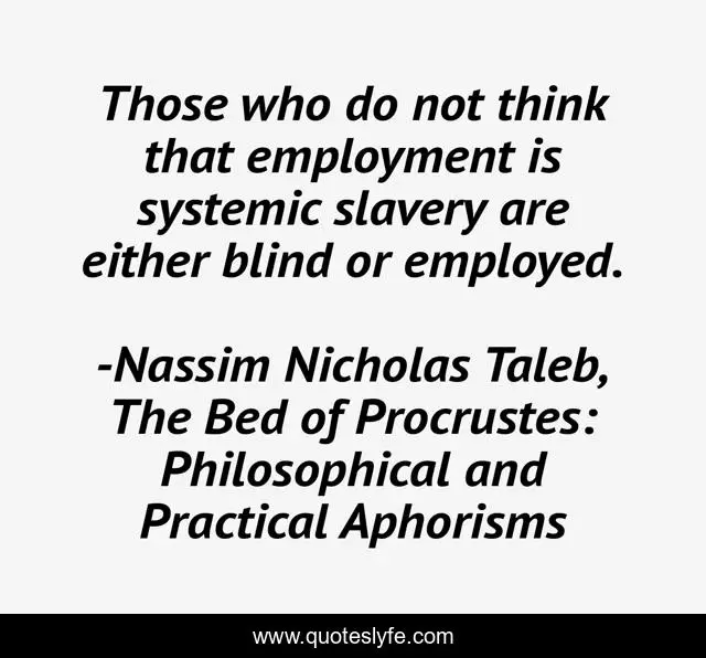 This page presents the quote "Those who do not think that employment is systemic slavery are either blind or employed.". Author of this quote is Nassim Nicholas Taleb, The Bed of Procrustes: Philosophical and Practical Aphorisms. This quote is about employment, slavery,.
