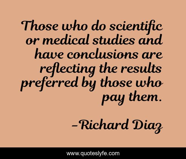 This page presents the quote "Those who do scientific or medical studies and have conclusions are reflecting the results preferred by those who pay them.". Author of this quote is Richard Diaz. This quote is about medicine, science, studies,.