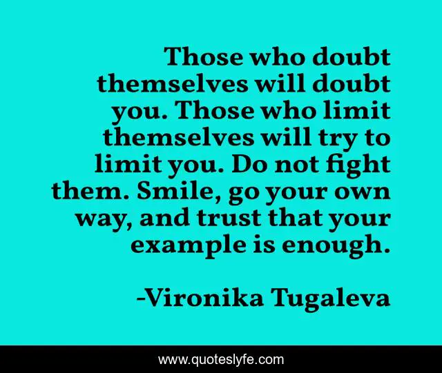 This page presents the quote "Those who doubt themselves will doubt you. Those who limit themselves will try to limit you. Do not fight them. Smile, go your own way, and trust that your example is enough.". Author of this quote is Vironika Tugaleva. This quote is about criticism, self-respect, integrity, doubt, dealing-with-criticism, judgment,.