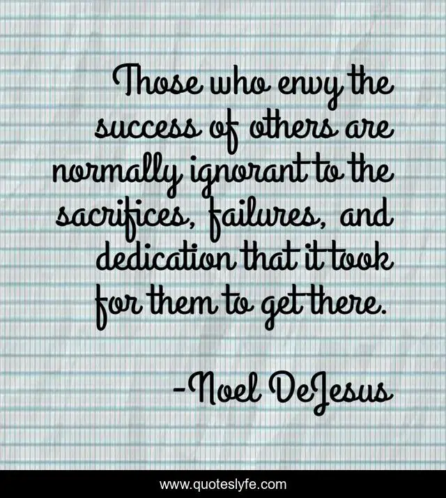 This page presents the quote "Those who envy the success of others are normally ignorant to the sacrifices, failures, and dedication that it took for them to get there.". Author of this quote is Noel DeJesus. This quote is about envy, success, life-lesson, jealousy, motivation, failure, leadership, dedication,.