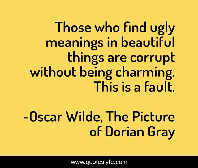 This page presents the quote "Those who find ugly meanings in beautiful things are corrupt without being charming. This is a fault.". Author of this quote is Oscar Wilde, The Picture of Dorian Gray. .