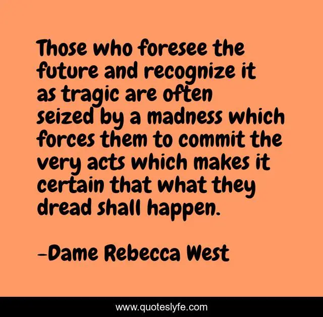 This page presents the quote "Those who foresee the future and recognize it as tragic are often seized by a madness which forces them to commit the very acts which makes it certain that what they dread shall happen.". Author of this quote is Dame Rebecca West. This quote is about positive, confidence,.