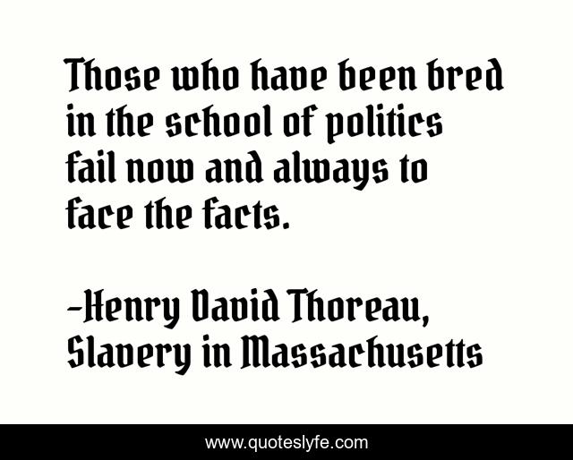 This page presents the quote "Those who have been bred in the school of politics fail now and always to face the facts.". Author of this quote is Henry David Thoreau, Slavery in Massachusetts. This quote is about politicians, truth,.