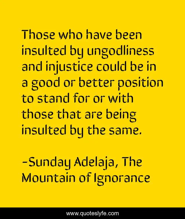 This page presents the quote "Those who have been insulted by ungodliness and injustice could be in a good or better position to stand for or with those that are being insulted by the same.". Author of this quote is Sunday Adelaja, The Mountain of Ignorance. This quote is about mountain, life, darkness, power, danger, god, people, ignorance, insult,.