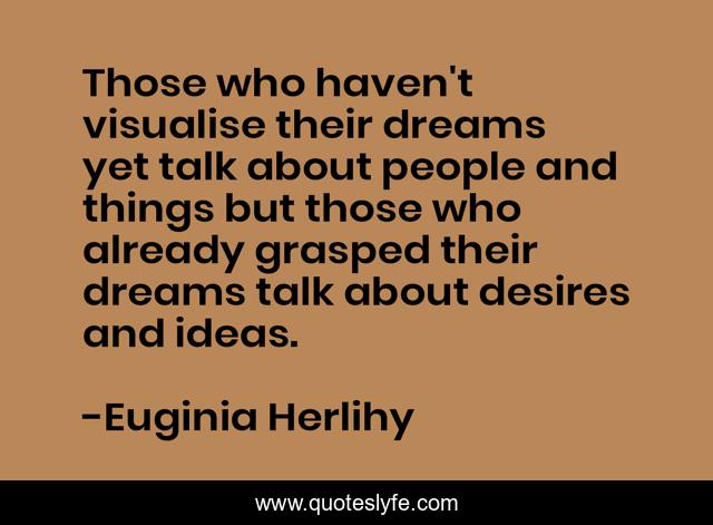 This page presents the quote "Those who haven't visualise their dreams yet talk about people and things but those who already grasped their dreams talk about desires and ideas.". Author of this quote is Euginia Herlihy. .