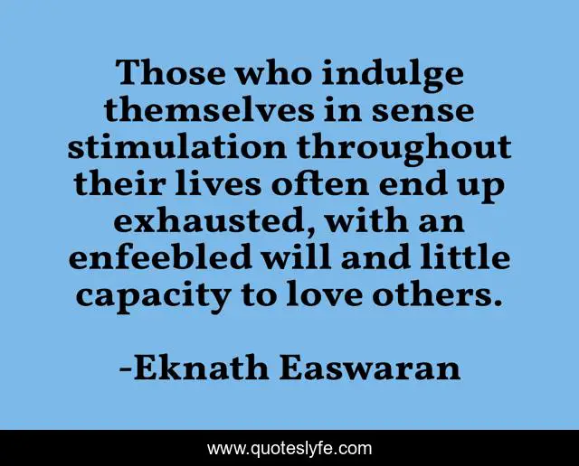This page presents the quote "Those who indulge themselves in sense stimulation throughout their lives often end up exhausted, with an enfeebled will and little capacity to love others.". Author of this quote is Eknath Easwaran. This quote is about choices, life, love-others, exhaustion, feelings,.