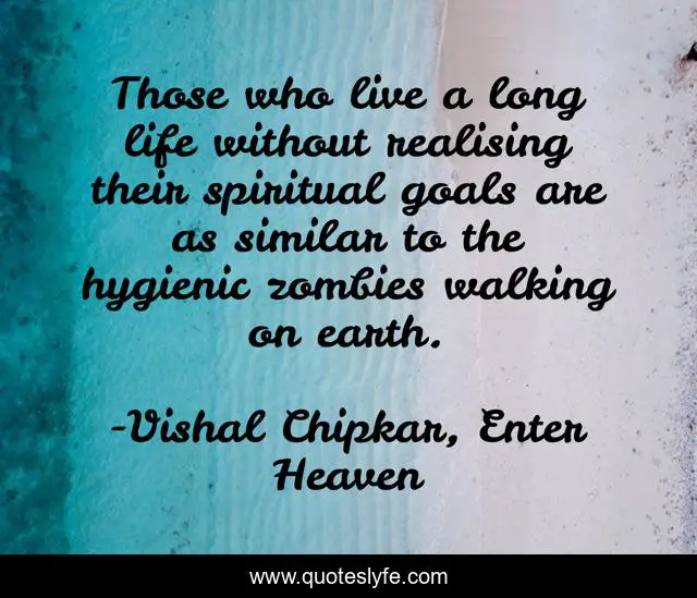 This page presents the quote "Those who live a long life without realising their spiritual goals are as similar to the hygienic zombies walking on earth.". Author of this quote is Vishal Chipkar, Enter Heaven. This quote is about supreme-power, earth, heaven, god, lord,.