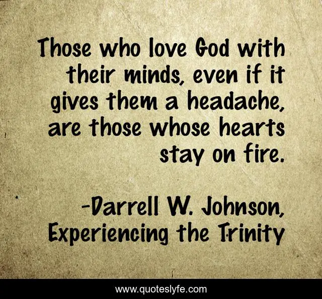 This page presents the quote "Those who love God with their minds, even if it gives them a headache, are those whose hearts stay on fire.". Author of this quote is Darrell W. Johnson, Experiencing the Trinity. This quote is about love-god, theology,.