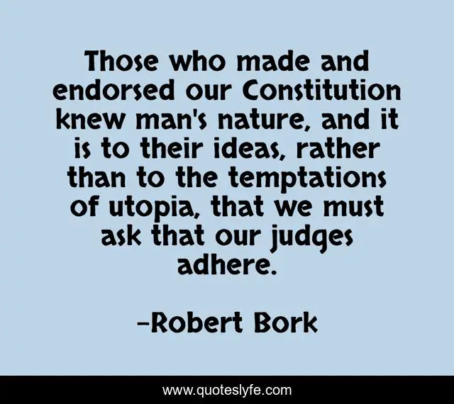 This page presents the quote "Those who made and endorsed our Constitution knew man's nature, and it is to their ideas, rather than to the temptations of utopia, that we must ask that our judges adhere.". Author of this quote is Robert Bork. This quote is about man, constitution, ideas,.