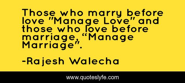 This page presents the quote "Those who marry before love "Manage Love" and those who love before marriage, “Manage Marriage".". Author of this quote is Rajesh Walecha. This quote is about love-story, marriage-life,.