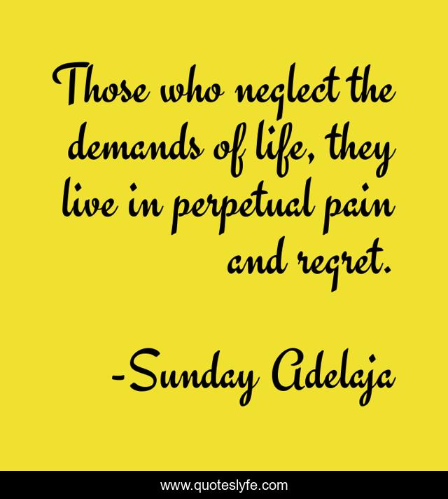 This page presents the quote "Those who neglect the demands of life, they live in perpetual pain and regret.". Author of this quote is Sunday Adelaja. This quote is about regrt, perpetual, pain, neglect, demands,.