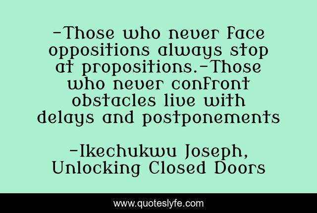 This page presents the quote "-Those who never face oppositions always stop at propositions.-Those who never confront obstacles live with delays and postponements". Author of this quote is Ikechukwu Joseph, Unlocking Closed Doors. This quote is about fictions, non-fiction-books-inspirational, christian-living, self-help,.