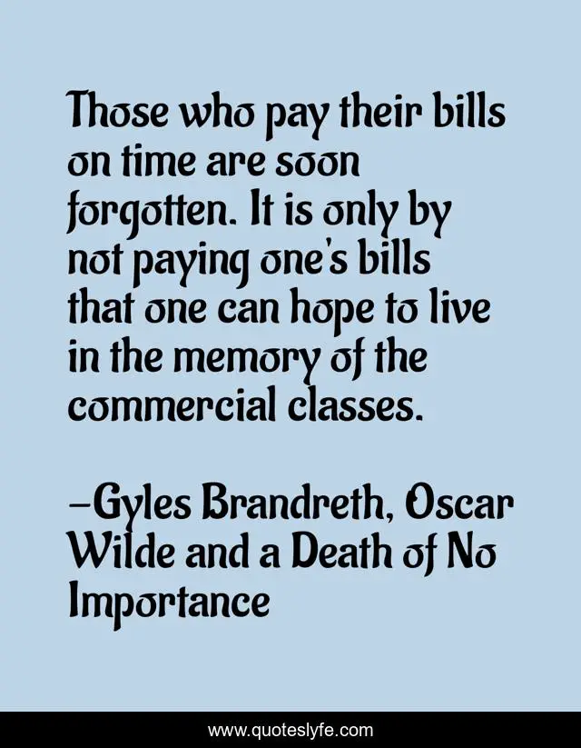 This page presents the quote "Those who pay their bills on time are soon forgotten. It is only by not paying one's bills that one can hope to live in the memory of the commercial classes.". Author of this quote is Gyles Brandreth, Oscar Wilde and a Death of No Importance. This quote is about mystery, oscar-wilde,.