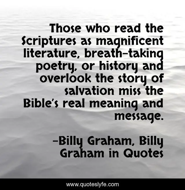 This page presents the quote "Those who read the Scriptures as magnificent literature, breath-taking poetry, or history and overlook the story of salvation miss the Bible’s real meaning and message.". Author of this quote is Billy Graham, Billy Graham in Quotes. This quote is about bible, billy-graham,.