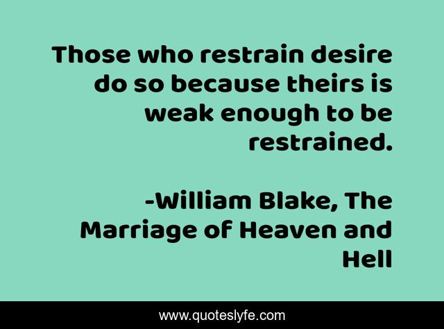 This page presents the quote "Those who restrain desire do so because theirs is weak enough to be restrained.". Author of this quote is William Blake, The Marriage of Heaven and Hell. This quote is about desire, self-control,.