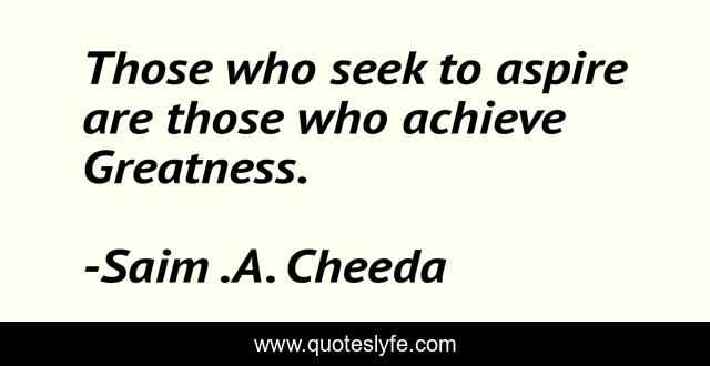 This page presents the quote "Those who seek to aspire are those who achieve Greatness.". Author of this quote is Saim .A. Cheeda. This quote is about strive-for-more, evolve, leaders, revolutionaries, take-actions-on-your-dreams, greatness, aspire, seek, achieve,.